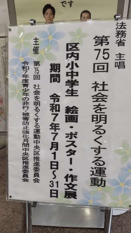 今月末まで、社会を明るくする運動の入選作品が中央区役所に掲示されています。我が校からの入選作品もあり、2学期に区長から表彰を受ける予定です。