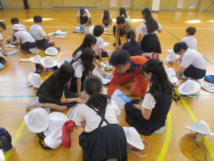 中央消防署の方が来てくださり、地域の防災はどうなっているのか、またAEDの使い方や簡易スリッパの作り方などたくさんのことを教えていただきました。
