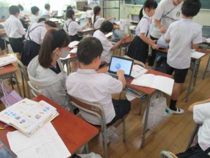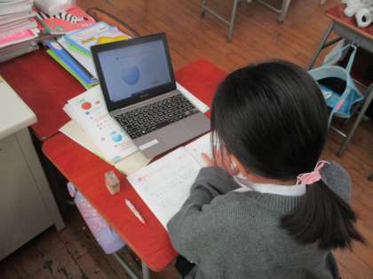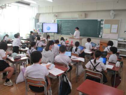 3年生の算数では、「円と球」の学習をしています。1人1台タブレットを使用して球をいろいろな角度で切った場合、どんな形になるのかなど気づいたことをノートにまとめました。