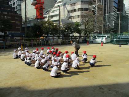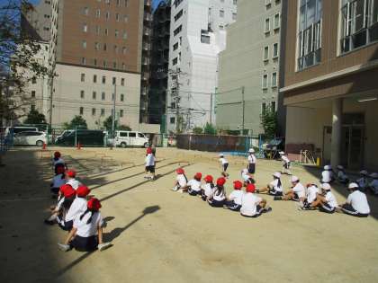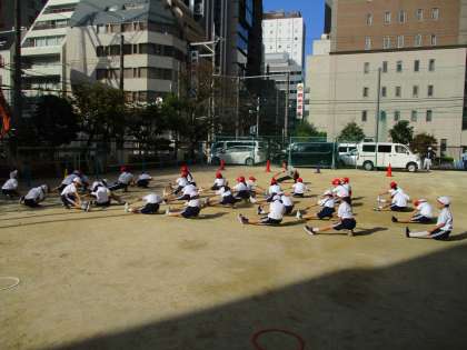休み明けの子どもたちは、校庭でのびのびと体を動かして嬉しそうです!まずは、班ごとの「おにごっこ」。つづいて、ハードルを飛び越えることを組み込んだリレーをしました。バトンタッチをスムーズに行うために、「右手でバトンをもらったら、すぐ左手にもちかえる。」の声かけのもと、真剣な様子で走る子どもたちでした!