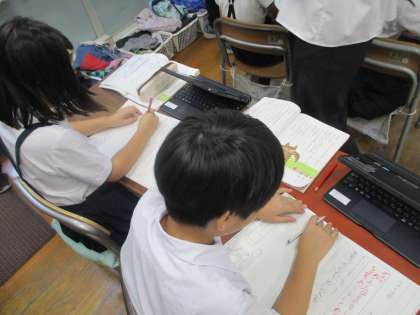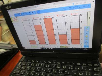国語科『ニャーゴ』の学習では、ねこの気持ちの変化を読み取り、音読であらわしました。タブレットを使ってねこの気持ちを考えたり、グループで自分の考えを伝えあったりすることも上手になっています。