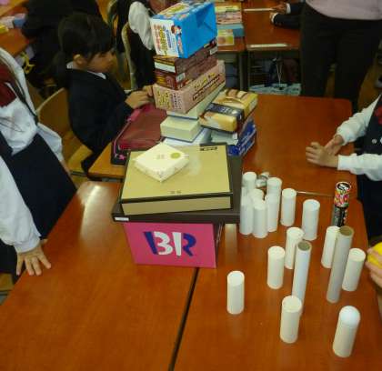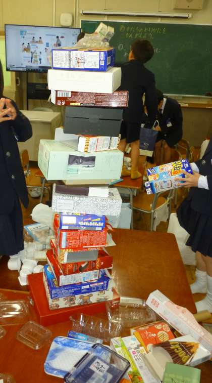 箱を高く積み上げていくには、どのように積めばいいのかグループで話し合い、何回か崩れながらも、協力しあって自分の背の高さを超えたグループもありました。