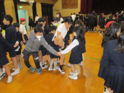 なかよし班(縦割り班)でチームになって「人間知恵の輪ゲーム」をしました。