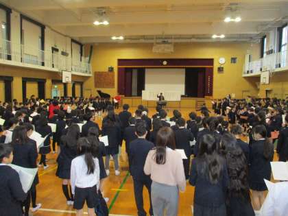 体育館に全校児童、全教職員が集まって「ハッピーマジック」を一緒に歌いました。