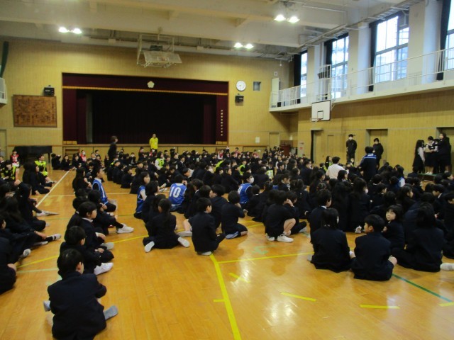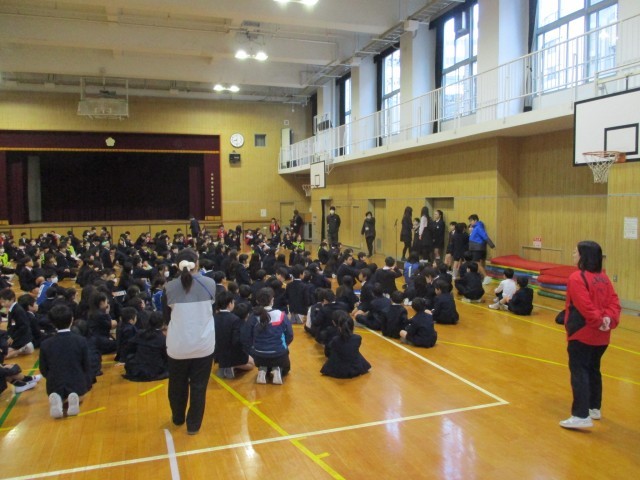 全校児童と教職員が体育館に集まって、児童集会がありました。