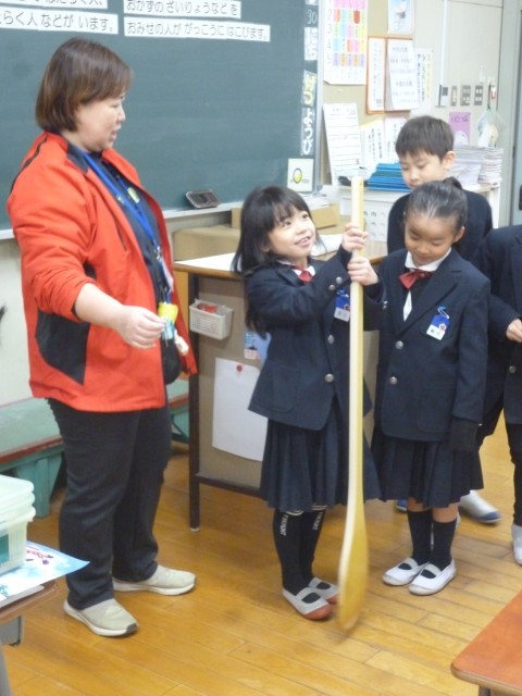 また、実際に給食室で使われている大きな重いしゃもじを持たせていただき、給食調理員さんがみんなのためにいつも頑張って作ってくださっていることを知りました。