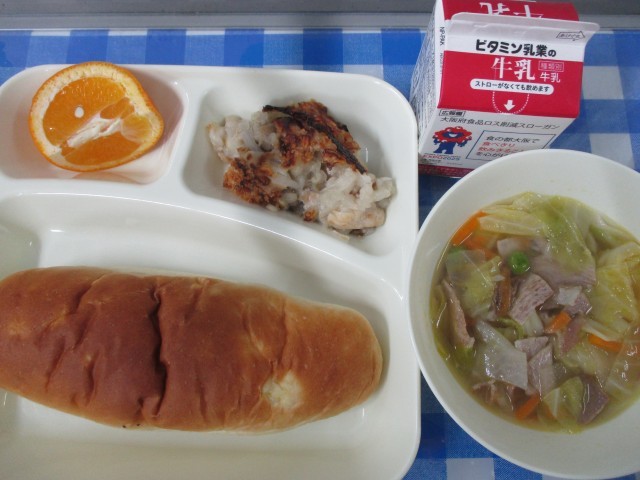 今日の給食は、押し麦のグラタン、スープ、いよかん、おさつパン、牛乳でした。