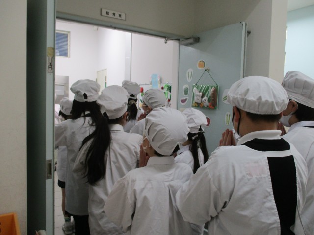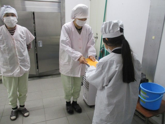 給食を取りに来るときに、学級を代表して給食当番の児童が給食調理員の方へ感謝の気持ちを伝えるメッセージを渡していました。