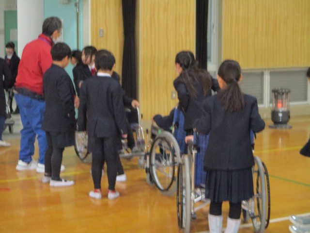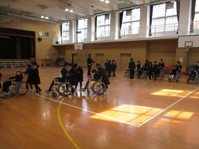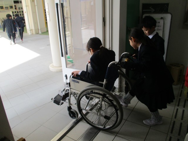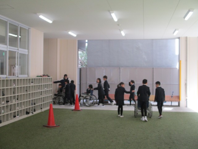 体育館や廊下、オアシス、玄関のスロープなどで人に車いすに座ってもらって押したり、自分が車いすに座って押してもらう体験です。