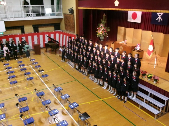 卒業生は6年間を振り返り、感謝と惜別の気持ちを歌と言葉に込め、在校生はそれに応えるべく力強い呼びかけと歌で6年生を見送りました。