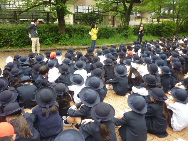 本校は運動場が狭いため、いったん運動場に避難した後、近くの東横堀川公園へ移動する訓練も行いました。