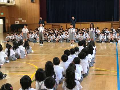 はじめによろしくねカードをもらって、ジャンボじゃんけんをしました。1、2年生のペアで何をだすか相談し、勝ったり負けたりして大盛り上がりでした。