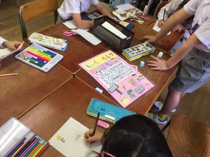 かわいい1年生が入学してから1ヶ月がすぎ、早く1年生と関わりたいと思っていた2年生。交流会でわたすお名前カードや各教室の案内板を一生懸命になって作っていました。