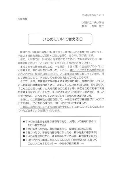 ご家庭でも、本日持ち帰っております下記の手紙をもとにして、話し合ってください。よろしくお願いいたします。