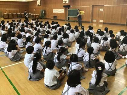 2年生は,学年で講堂に集まり,フリップを用いながら,どんなことがいじめにつながるのか・どれほど傷つくのか・いじめを見過ごさない仲間づくりについて子どもと一緒に考えながら話をすすめていきました。