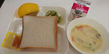 今日の給食は、コーンクリームシチュー・キャベツときゅうりのサラダ・かわちばんかん・食パン・アプリコットジャム・牛乳でした。