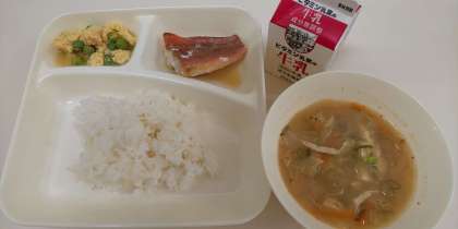 今日の給食は「あかうおのしょうゆだれかけ、みそ汁・えんどうの卵とじ、ごはん、牛乳」でした。