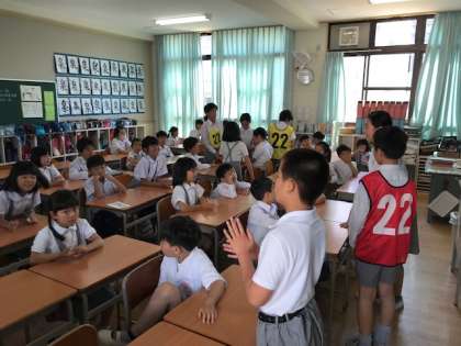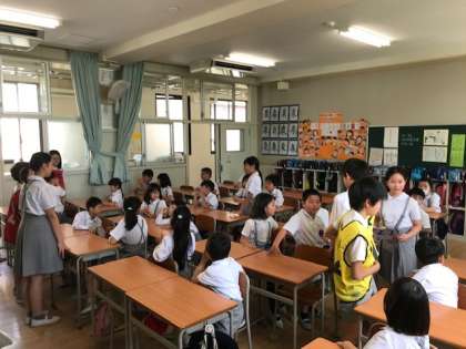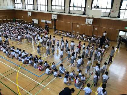 本日、今年度のたてわり編成がありました。各教室に初めてたてわり班で集まり、並び方の確認をしたり、名前を覚え合うゲームをしたりして、楽しみました。その後、講堂に集まり、集会のときのルールや退場の仕方のお話を聞きました。