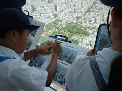 今日は、社会見学であべのハルカスの展望台へ行き、大阪市の様子を調べました。お天気も良かったので、生駒山や葛城山まで見ることができました。東西南北それぞれの特徴を見つけながら、ワークシートに自分の考えをまとめていました。