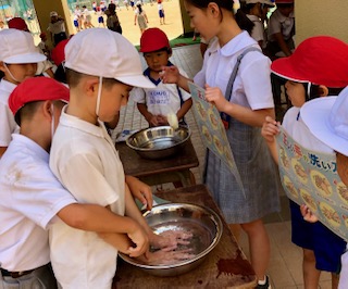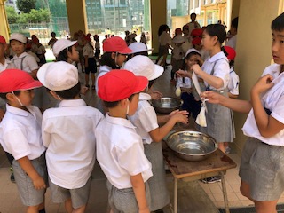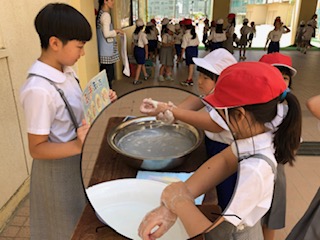ピロティ−では、健康委員会が20分休みに、正しい手洗いのやり方を教えてくれています!!