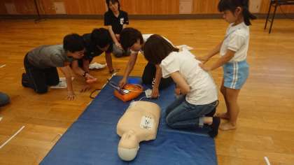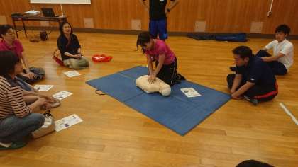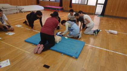 本日、4時より、普通救命講習会を行いました。教職員とPTAの方々と一緒に、倒れている人を見かけたときの対処法や、胸骨圧迫・人工呼吸の仕方、AEDの使い方を練習しました。