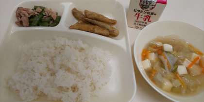 今日の給食は「いわしてんぷら、すまし汁、豚肉とさんどまめのいためもの、ごはん、牛乳」でした。いわしてんぷらは、1尾丸ごと食べることができるのでカルシウムたっぷりです。
