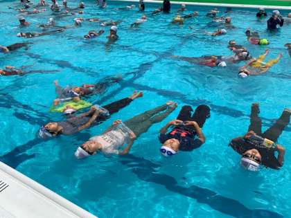衣服を着た状態では、体が重く感じ泳ぎにくいことを体験し、もしもおぼれそうになった際は、無理に泳ごうとするのではなく、浮いて助けを待つことが大切だと知りました。でも、浮くということが意外に難しく、空のペットボトルを持って、力を抜いて、水に浮く練習をしました。