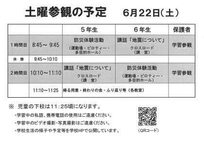 明日(6/22)は5・6年の土曜参観「防災教室」です。