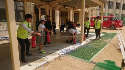 消火器は15秒間しか出ないので、火元に向かって素早く消火することがポイントです。
