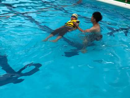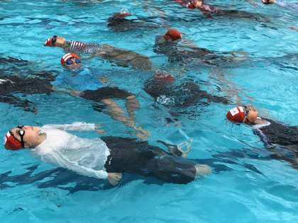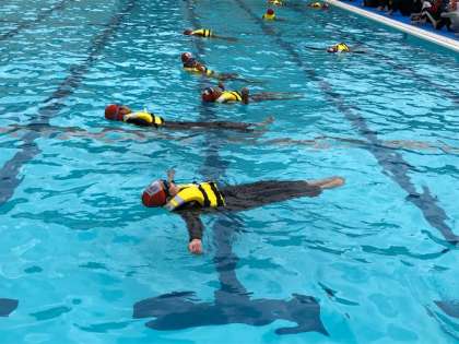 衣服を着用した状態は、体が重くなり泳ぎづらくなりますが、一生懸命平泳ぎをしました。その後、ライフジャケットを着けたときに力を抜いて浮くなどを体験しました。