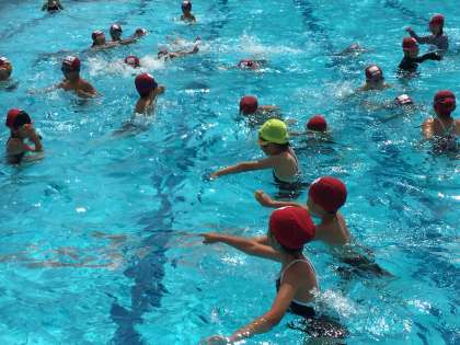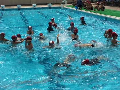 2年生の水泳学習の締めくくりとして、クラス対抗の宝探しゲームをしました。水の中にもぐり、みんな必死に宝を探しました。