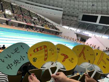 今日、6年生9名が東和薬品ラクタブドームで行われた大阪市児童水泳記録会に参加しました。50mの広いプールでのびのびと気持ちよく泳ぐことができました。緊張している姿も見られましたが、応援席に手を振る余裕も見せてくれました。また、手作りのうちわで友だちを一生懸命応援していました。夏休みの楽しい思い出を作ることができたと思います。