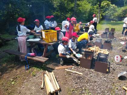 火を起こしてご飯を炊いたり、野菜など具材の下ごしらえをしたり…。