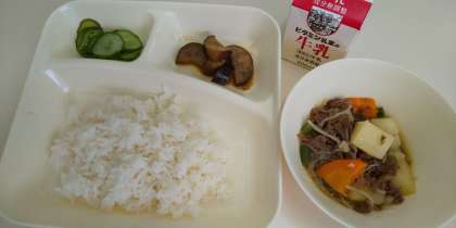 今日の給食は、「肉じゃが、焼きなすのみそだれかけ、あっさりきゅうり、ごはん、牛乳」でした。運動会の練習で疲れている子どもたちですが、しっかり食べることができました。なすは大好きだからお替りしたよ。なすは苦手だけど頑張って食べるよ。と元気いっぱいの声が聞こえてきました。