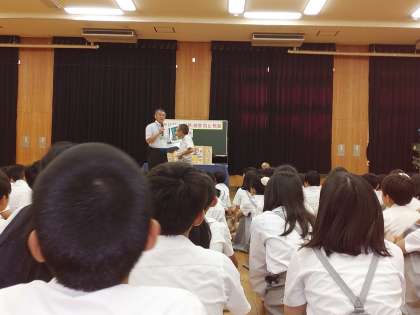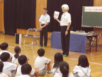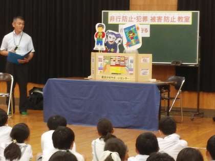 難波少年サポートセンターの方の子ども達の健全育成のための教室です。万引き・夜遊び・タバコ・暴力など非行についての説明を聞いたり、劇を通してなぜ万引きはいけないか考えたりしました。