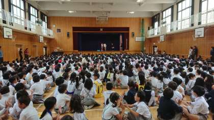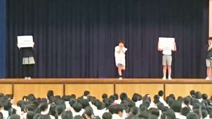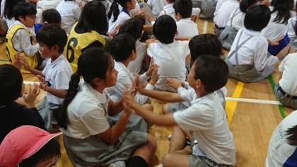 今日の児童集会では、劇に出てくるキーワードに合わせて、ペアと手をたたくゲームをしました。