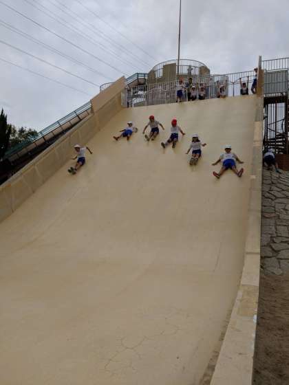 大泉緑地に秋の遠足へ行きました。アスレチックや大広場などがあり、思う存分に体を動かし、たくさん遊びました。中でも大きなすべり台が大人気!高い所からのスタートに少しドキドキしながら、楽しそうにすべっていました。お弁当は大広場で食べました。広い場所でおいしいお弁当を食べ、話も盛り上がりました。