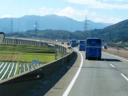 キリもすっかり晴れ、伊勢道を一路、組体操の曲や子ども達のリクエストの音楽を聴きながら、会話をしながらバス旅を楽しんでいます。
