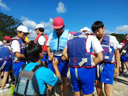 救命胴衣を着用した後、海上では立たない、救命胴衣はぬがない、水分はとると、三つの約束の確認をしました。