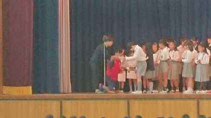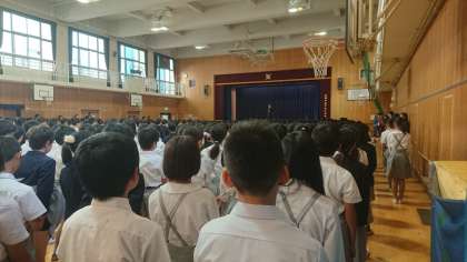 今日の児童朝会では、副校長先生、看護当番の先生からのお話と、夏休みのプールの皆勤賞の表彰がありました。