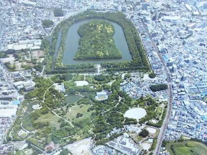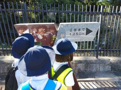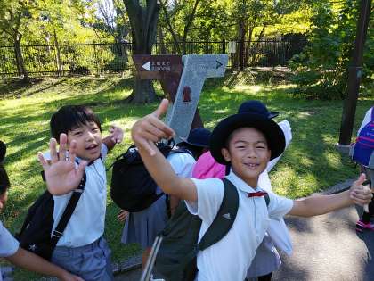 行き先は、大仙公園。まず、三国ヶ丘駅を下車し、日本一最大級の前方後円墳の周りを歩いて、大きさを実感しました。「ここから1250mや!遠いなあ。」と、案内板を見ては、距離を確認しながら進みました。