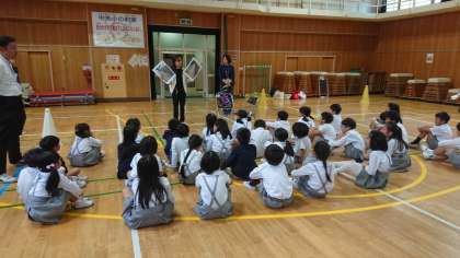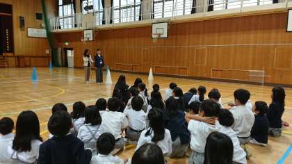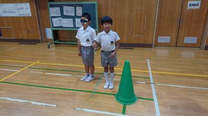 25日、ふれあいセンターモモの職員の方と地域の見守りをされている方々、また地域にお住いの目の不自由な方に来ていただき、アイマスク体験の学習をしました。体験をする前に、目の不自由な方の普段の生活の様子や町中の歩き方についてお話していただきました。駅のホームなどで、事故も起きているとお聞きし、手引きの仕方を教わりました。手引きをする時には、ぶつからないように気をつけたり、角を曲がるときに必ず声をかけないといけなかったり、子どもたちは緊張した様子でしたが、最後まで頑張っていました。