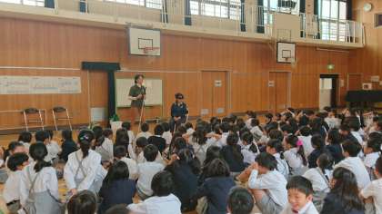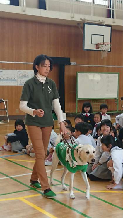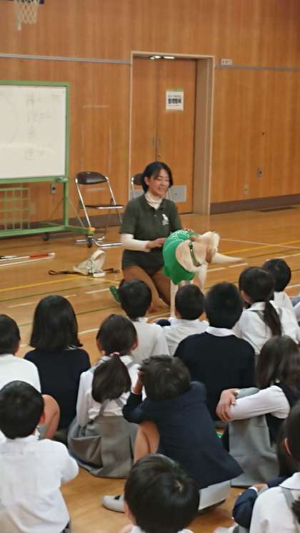先日のアイマスク体験に続いて、今日は日本ライトハウス盲導犬訓練所の方に来ていただき、盲導犬の訓練について詳しく教えていただきました。指示を聞いて行動していたり、曲がり角できちんと止まっていたりする盲導犬の姿を見て、子どもたちは盲導犬のかしこさに驚いていました。