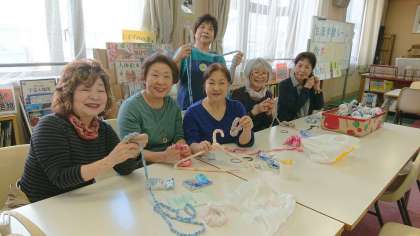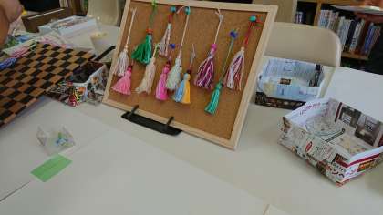 図書室では、ぬり絵、手編み工作、数合わせカードゲーム、手作りアクセサリーのコーナーがあります。