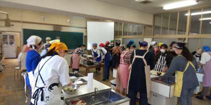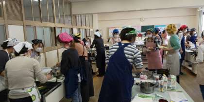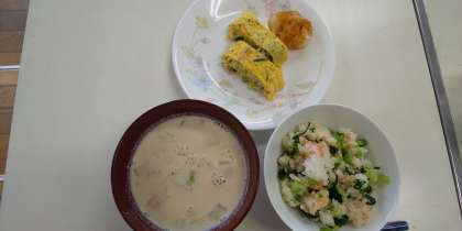 きょうは、PTA主催で「簡単!お手軽‼朝ごはん料理教室」が開催されました。日本乳業協会の方を講師に迎え「小松菜と鮭の混ぜご飯、牛乳入り厚焼き卵、白菜とベーコンのみそ汁」をつくりました。混ぜご飯にはスキムミルク、厚焼き卵には粉チーズ、みそ汁には牛乳を使用して、カルシウムをしっかりとることができる献立でした。