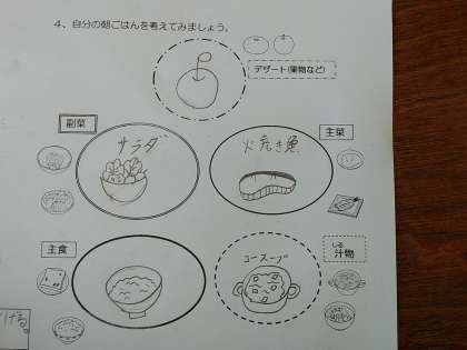 そのためには、1日の生活リズムや、主食・主菜・副菜をそろえたバランスのよいメニューが大事であることも学習しました。