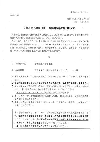 本日(2月13日)、2年4組と3年1組は、給食後の13:30頃に下校予定です。