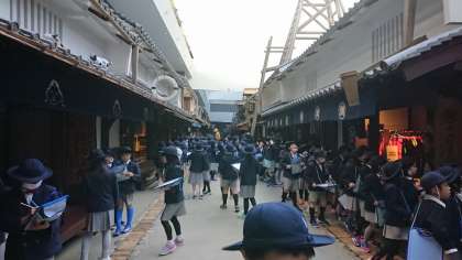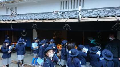 社会見学「くらしの今昔館」に行きました。昔の町並みが再現されている所を歩いてみると、薬屋さんや呉服屋さん、おもちゃ屋さんなど昔ながらのお店が並んでいたり、昔の暮らしがわかる長屋を見たりすることができました。昔の家の台所やトイレの違いに子どもたちはびっくりしていました。これから社会の学習で、昔のくらしの道具についてなどもっと学習していきたいと思います。