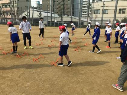 今日は子どもの体力向上事業の取組で、5年生に走り方を教えに来てもらいました。