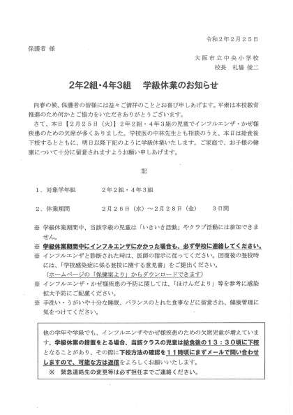 本日(2月25日)、2年2組と4年3組は、給食後の13:30頃に下校予定です。